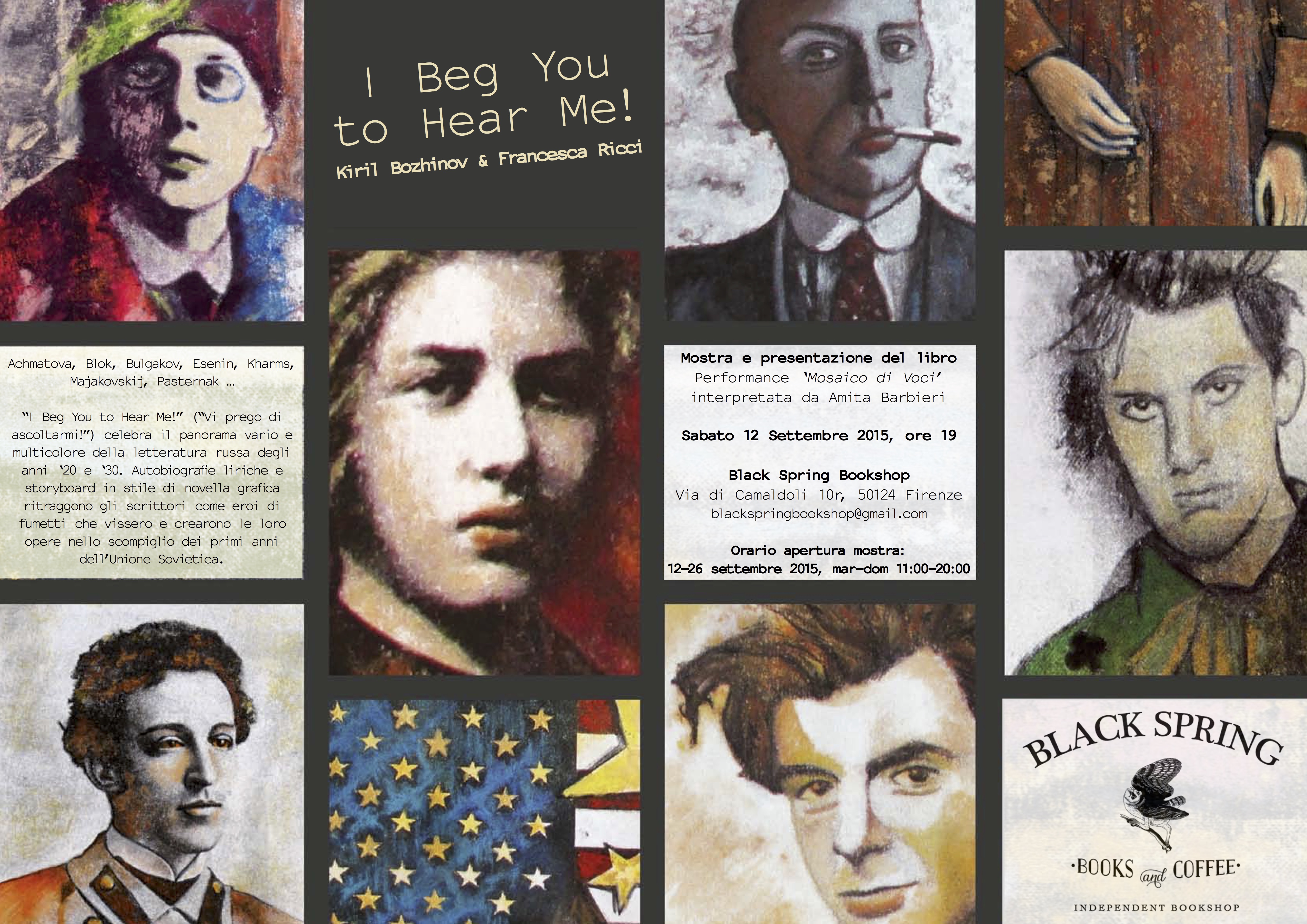 “I Beg You to Hear Me!” (“Vi prego di ascoltarmi!”) celebra il panorama vario e multicolore della letteratura russa degli anni ’20 e ’30. Autobiografie ‘liriche’ e storyboard in stile di novella grafica ritraggono gli scrittori come eroi di fumetti che vissero e crearono le loro opere nello scompiglio dei primi anni dell’Unione Sovietica. Questa pubblicazione è il risultato di un progetto multimediale presentato alla Galleria dalla Rosa di Londra nel 2011. Edizione limitata di 150 copie, numerate e firmate.