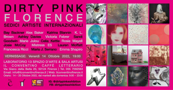 On the occasion of the launch of the new contemporary art space Laboratorio 13 Spazio d’Arte, with the support of Associazione Città Sostenibile on behalf of il Conventino Caffè Letterario and La Corte Arte Contemporanea (Rosanna Tempestini Frizzi), we present “Dirty Pink Florence. Sixteen International Artists”, here in its second edition after its launch at Sporting Club Russafa, Valencia, Spain, in 2021. The exhibition is curated by Tina McCallan (artist and curator), organised by Francesca Ricci (artist) and Erica Briani Pereyra (artist and set designer) in Florence with the technical support of Josie McCoy (artist). Dirty Pink presents a selection of works responding to the concept of ‘pink’ through painting, print, photography, video, performance, installation, NFTs and augmented reality by sixteen artists from Australia, Italy, Kuwait, UK, US and Uruguay. It aims to bring together female artists and create an artistic dialogue between them and their artwork as well as create opportunities for exhibiting internationally in a (still) male dominated art world.We are delighted to be collaborating with Il Conventino to host the second edition, in the historic city of Florence and to be included in the OFF programme of the festival L’Eredità delle Donne (The Legacy of Women) which takes place from 21st-23rd October.