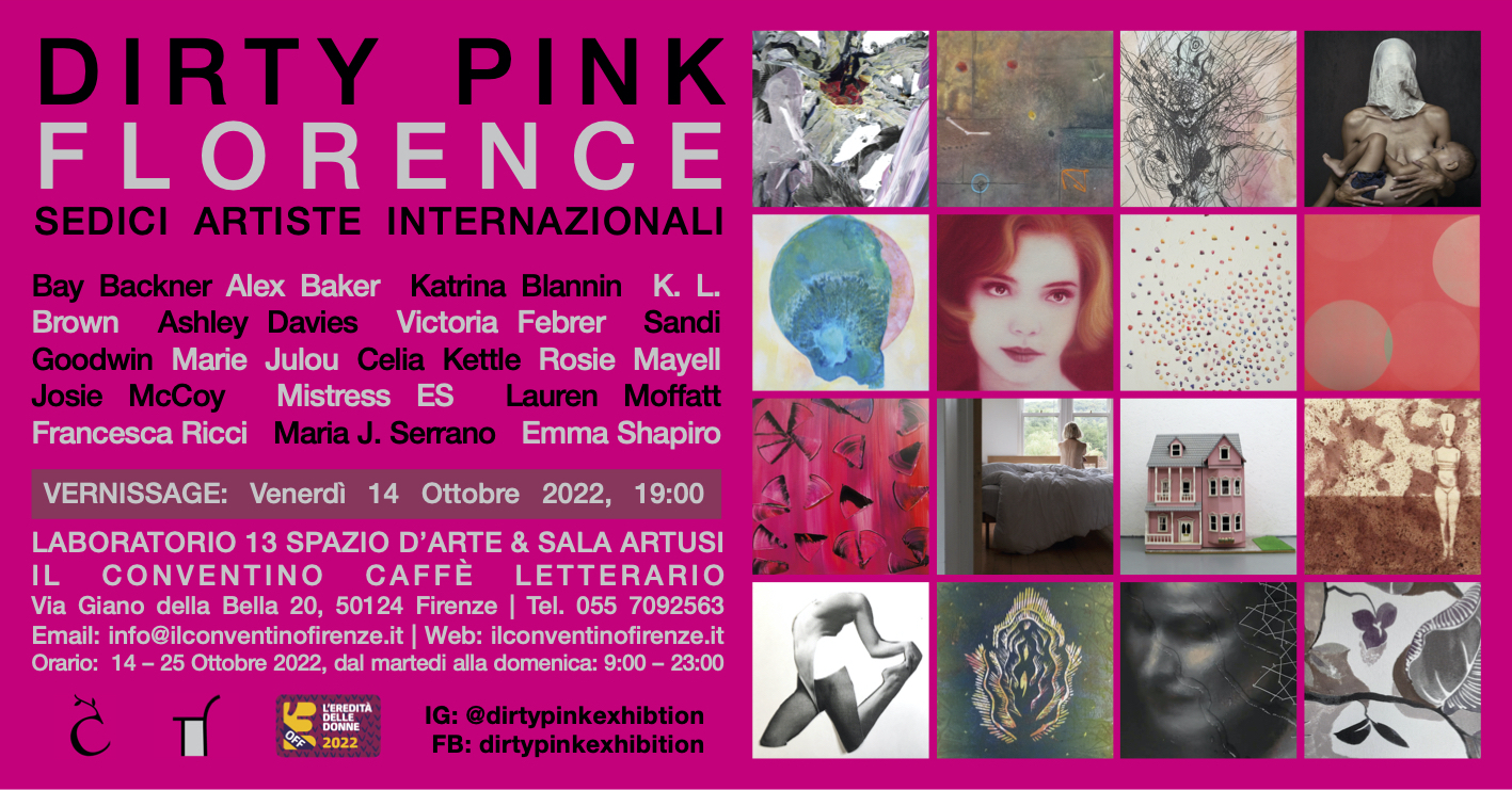 On the occasion of the launch of the new contemporary art space Laboratorio 13 Spazio d’Arte, with the support of Associazione Città Sostenibile on behalf of il Conventino Caffè Letterario and La Corte Arte Contemporanea (Rosanna Tempestini Frizzi), we present “Dirty Pink Florence. Sixteen International Artists”, here in its second edition after its launch at Sporting Club Russafa, Valencia, Spain, in 2021. The exhibition is curated by Tina McCallan (artist and curator), organised by Francesca Ricci (artist) and Erica Briani Pereyra (artist and set designer) in Florence with the technical support of Josie McCoy (artist). Dirty Pink presents a selection of works responding to the concept of ‘pink’ through painting, print, photography, video, performance, installation, NFTs and augmented reality by sixteen artists from Australia, Italy, Kuwait, UK, US and Uruguay. It aims to bring together female artists and create an artistic dialogue between them and their artwork as well as create opportunities for exhibiting internationally in a (still) male dominated art world.We are delighted to be collaborating with Il Conventino to host the second edition, in the historic city of Florence and to be included in the OFF programme of the festival L’Eredità delle Donne (The Legacy of Women) which takes place from 21st-23rd October.