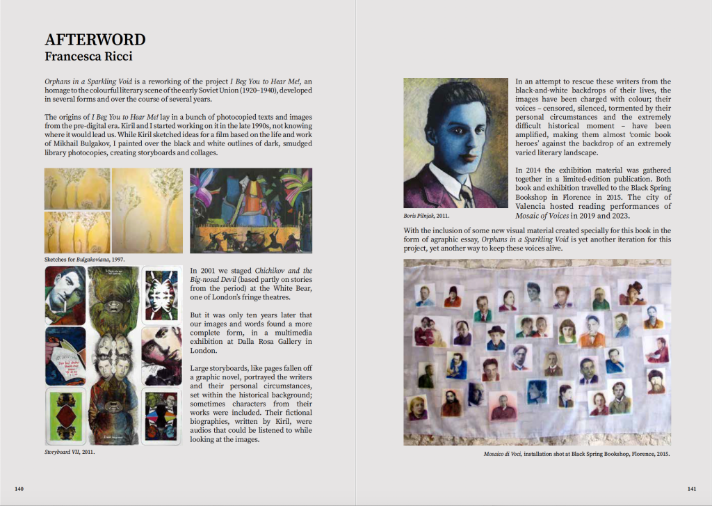 It has been wonderful and challenging revisiting this project on Soviet Literature from the 1920s–1940s, giving it the new ‘graphic essay’ shape, working simultaneously in producing new visual material for it, designing the new format and translating it into Italian. I am also very pleased to see the original text by Kiril Bozhinov translated into Spanish thanks to the painstaking work of Gaston Gorga. Each language provides a different hue to the poetic images and the experimental passages of the book. In the Afterword, I go briefly through the different stages of this project homaging an entire generation of creative minds living and working under the repression of a dictatorship.