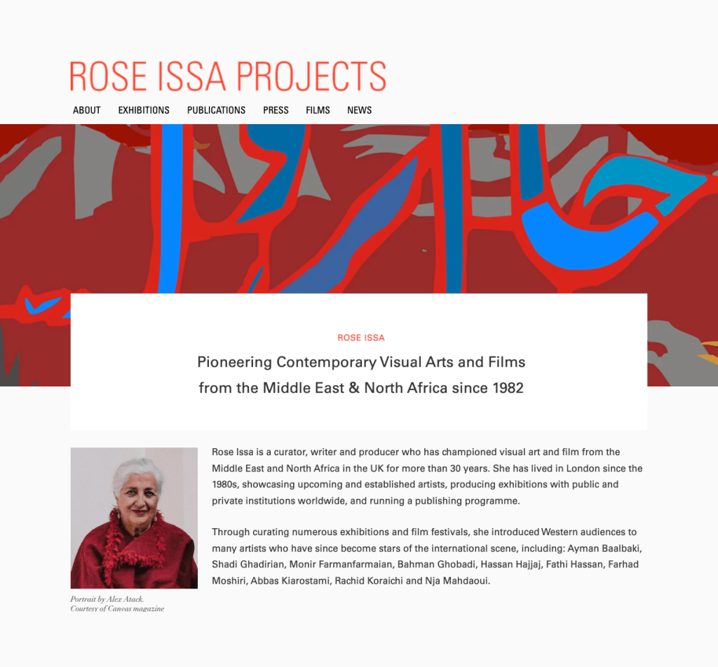 I have known Rose Issa since 1996 and have had the privilege of working with her since 2007, helping her in her mission of delivering knowledge and awareness about contemporary art from the Middle East. She’s not only a dearest friend, but a true cultural ambassador and a source of great inspiration throughout the development of my own artistic path. I have assisted Rose in producing many exhibitions, publications and talks. In 2020, we were faced, like everyone else, with an imposed moment of reflection, which prompted me to restructure the Rose Issa Projects website, as the focus of its activity had changed through the years.